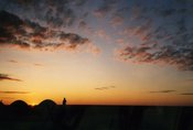 Réveil avant l’aube aujourd’hui ; le soleil se lève presque une heure plus tard : il naît de la platitude du désert comme je l’ai vu plusieurs fois en mer. Le spectacle est très beau. Le chauffeur, levé quelque temps auparavant, et qui a dû voir cela bien des fois, admire lui aussi en silence. Il réveille Sara pour la faire également profiter de ce lever si noble et majestueux. |